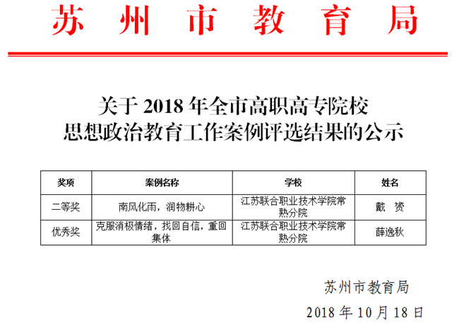 2018年10月18日,苏州市教育局发布了《关于2018年全市高职高专院校思想政治教育工作案例评选结果的公示》,我校基础部戴赟老师的案例作品《南风化雨,润物耕心》荣获苏州市二等奖、旅游管理系薛逸秋老师的案例作品《克服消极情绪,找回自信,重回集体》荣获苏州市优秀奖。